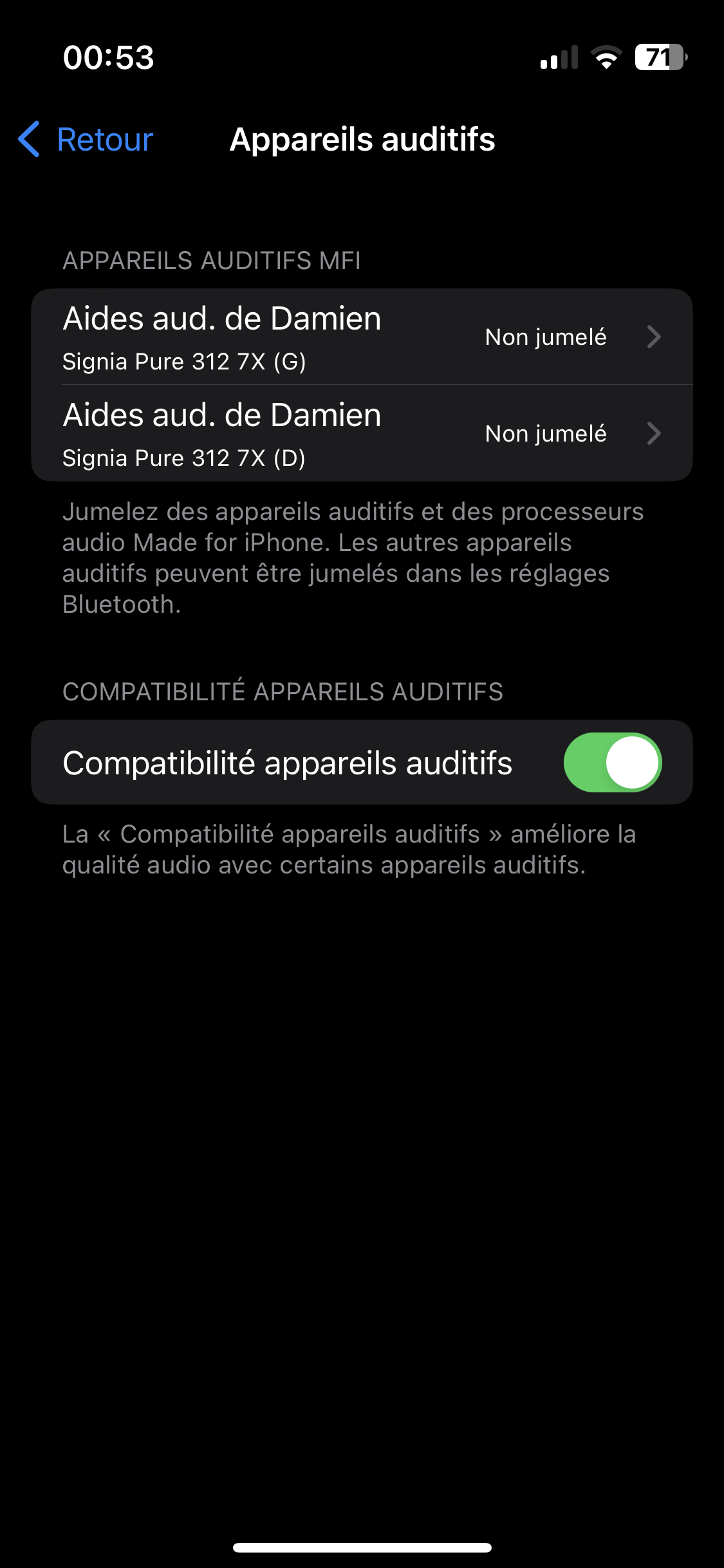 Bonjour, j’ai un soucis avec l’appairage de mes appareils auditifs. Maintenant il me propose d’appairer les 2 individuellement mais lorsque je réalise le premier je ne peux plus faire le 2 eme et celui-ci disparaît. Comment faire pour que les 2 soit appairer en même temps?