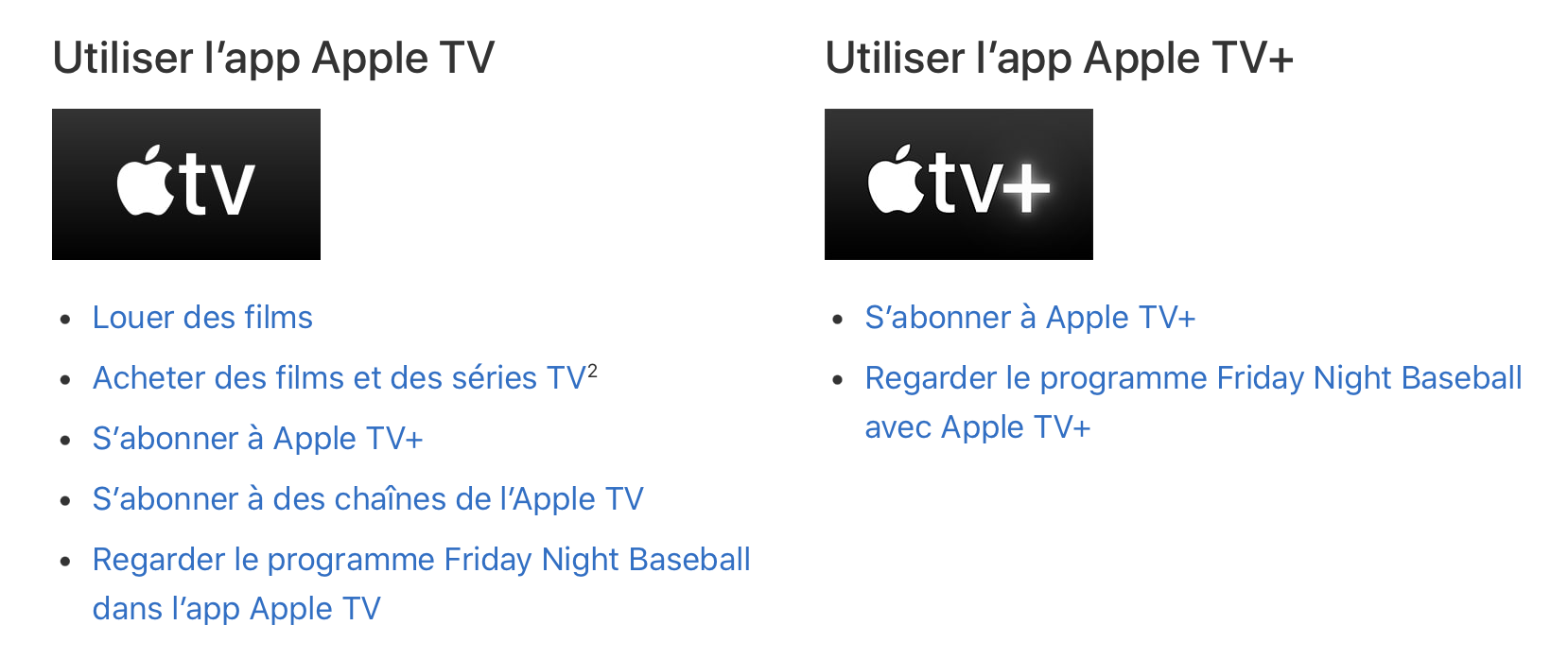 L'article Obtenir l’app Apple TV ou l’app Apple TV+ sur votre smart TV ou appareil de streaming - Assistance Apple (FR) fait la distinction entre les deux :