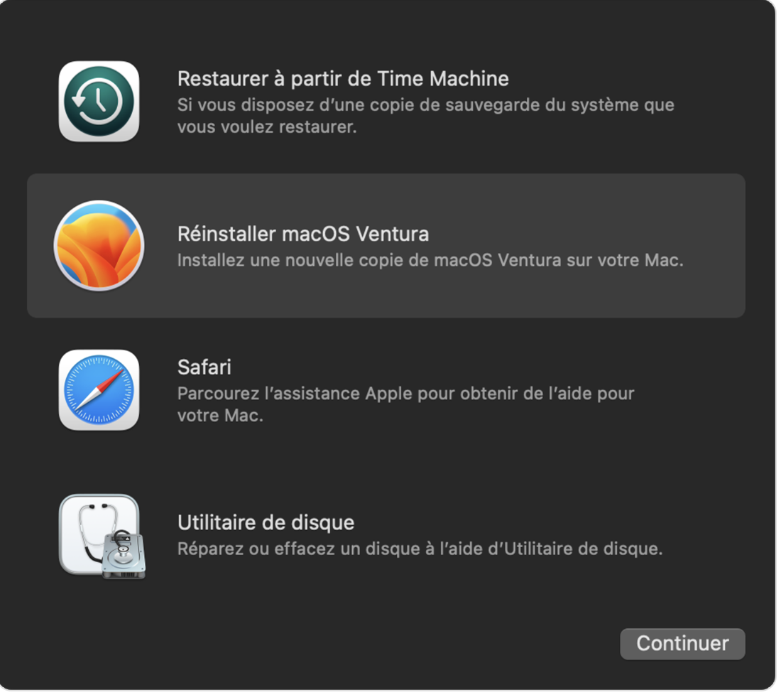 Éteignez votre Mac, allumez-le de nouveau et appuyez immédiatement sur les touches command + R. Maintenez les touches enfoncées jusqu'au moment où vous voyez l'écran de restauration (celui-ci est pour macOS Ventura mais la différence n'est pas importante) :