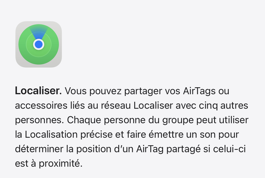 Les AirTags, les AirPods et d’autres accessoires du réseau Localiser comprennent des fonctionnalités qui empêchent tout suivi non désiré. Vous ne devez pas les utiliser pour suivre des personnes, ni pour localiser un objet qui ne vous appartient pas.