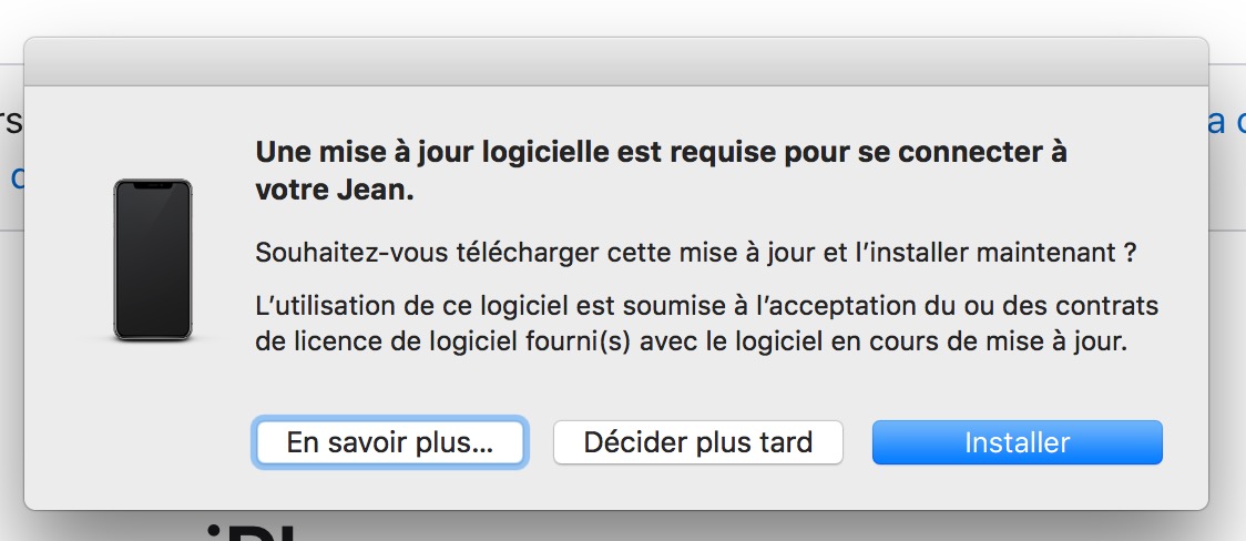 De mon coté, j'ai toujours et systématiquement rencontré un problème de ce type en connectant mon iPhone. Je clique OK sur le message d'erreur, et je peux continuer à faire ce que je veux sans souci. Je pense que le problème est chez Apple.