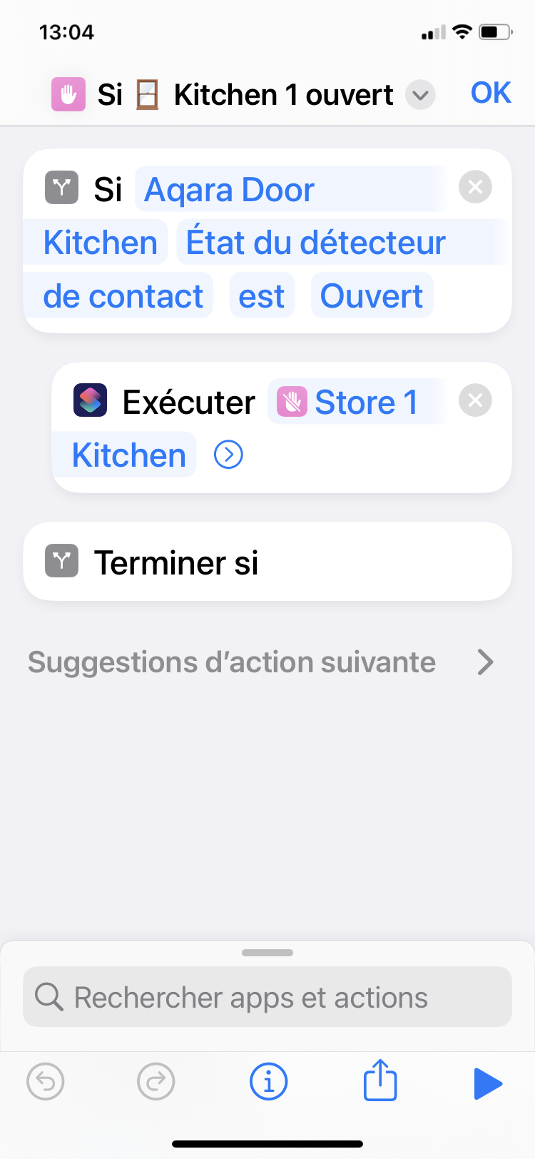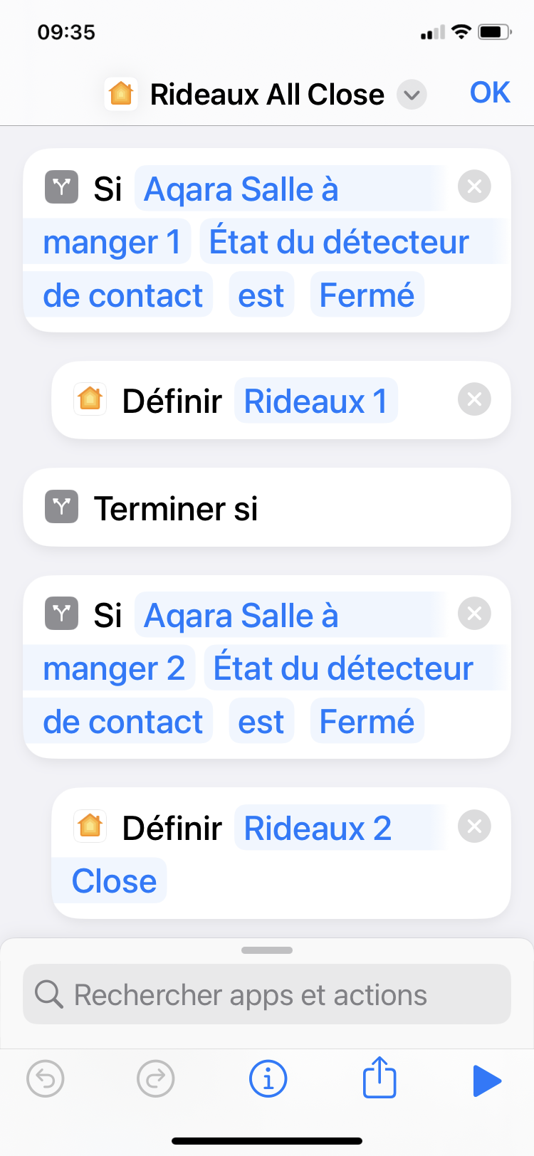 Comme j'ai tout effacé et refait, j'en ai profité pour simplifier l'ensemble. Maintenant, j'ai un seul Raccourcis pour gérer toutes les fenêtres ou portes au lieu d'un par détecteur Aqara.