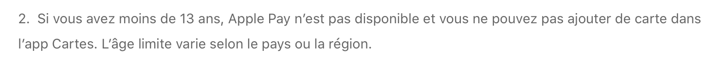 Tu fais bien de poser la question, car oui, tu as raison, il y a bien une limite pour l'utilisation d'Apple Pay, mais aussi d'autres services Apple lorsque cela concerne les enfants.