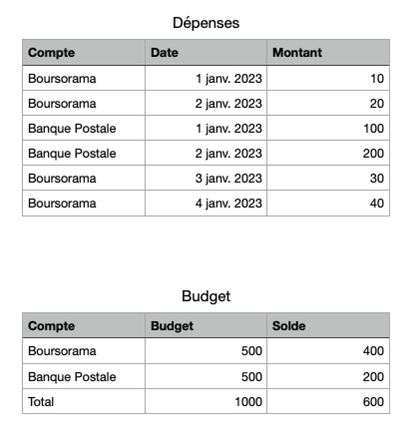 Dans un second tableau, j'y ai informé le solde de départ, mais je souhaite calculer le solde restant en fonction des dépenses réalisées au fur et à mesure.