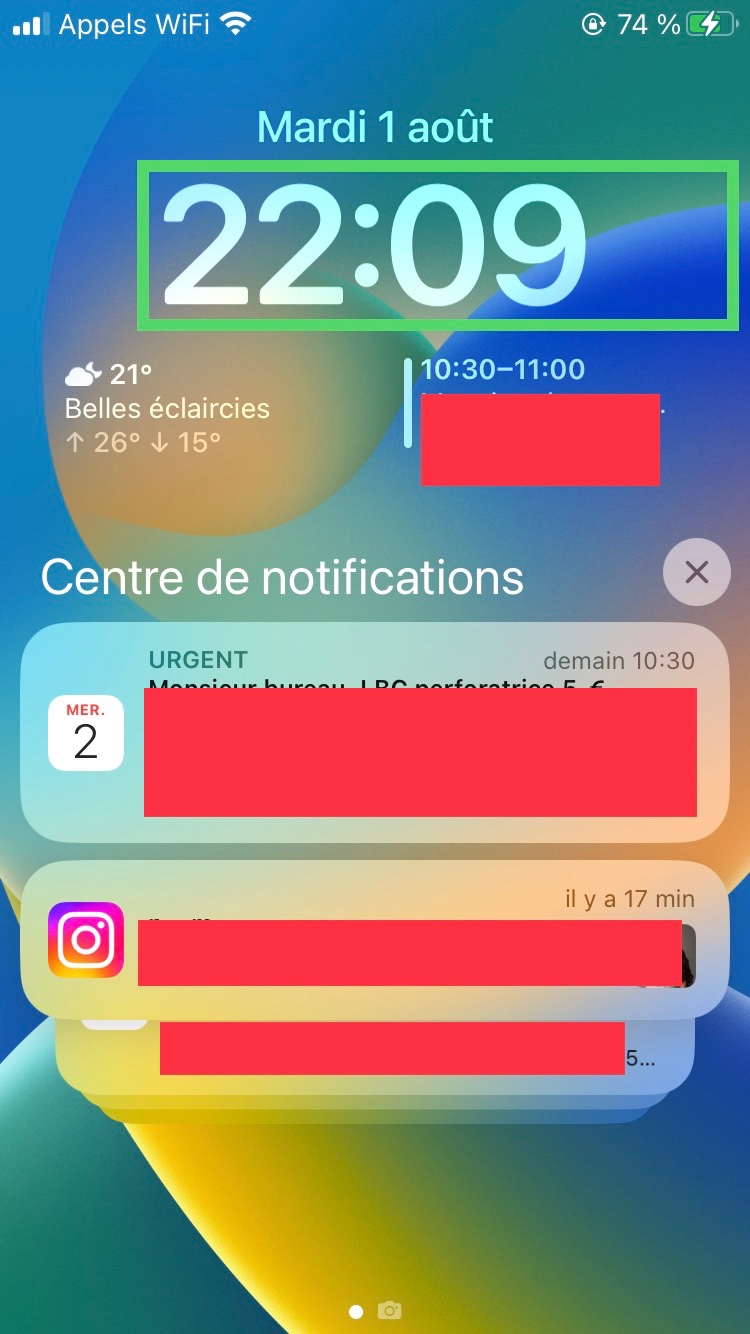 Dans l’encadré en vert, c’est l’heure présente sur l’écran de verrouillage.