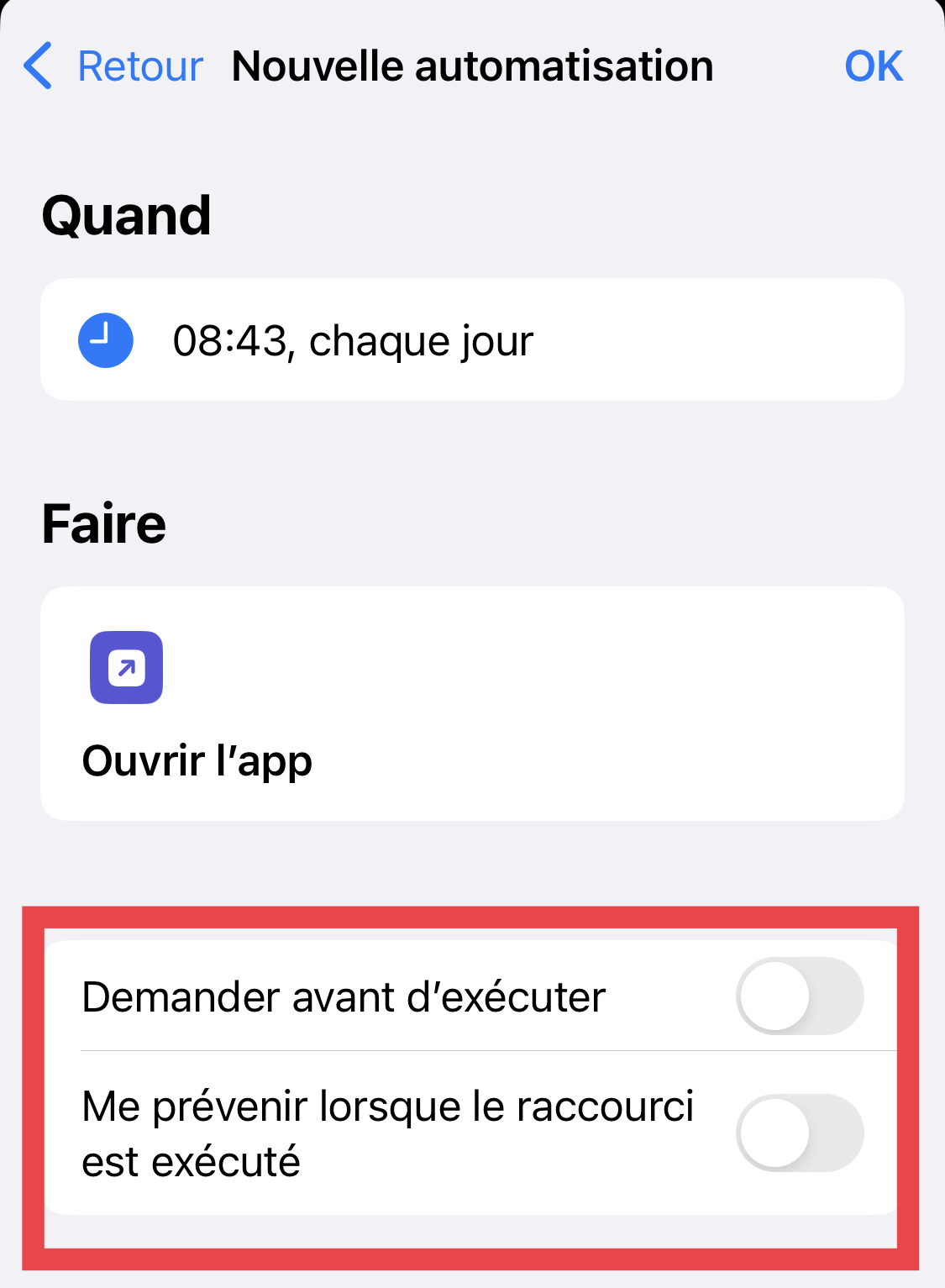 Seules les automatisations envoient des notifications ou demandent une confirmation avant l’exécution. Les raccourcis “normaux” ne le font pas.