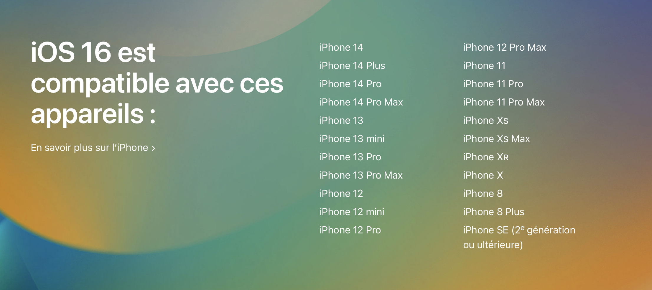 La page iOS 16 - Apple (FR) donne la liste des les modèles d'iPhone compatibles avec iOS 16 et l'iPhone 7 n'en fait pas partie comme tu peux le voir ci-dessous.