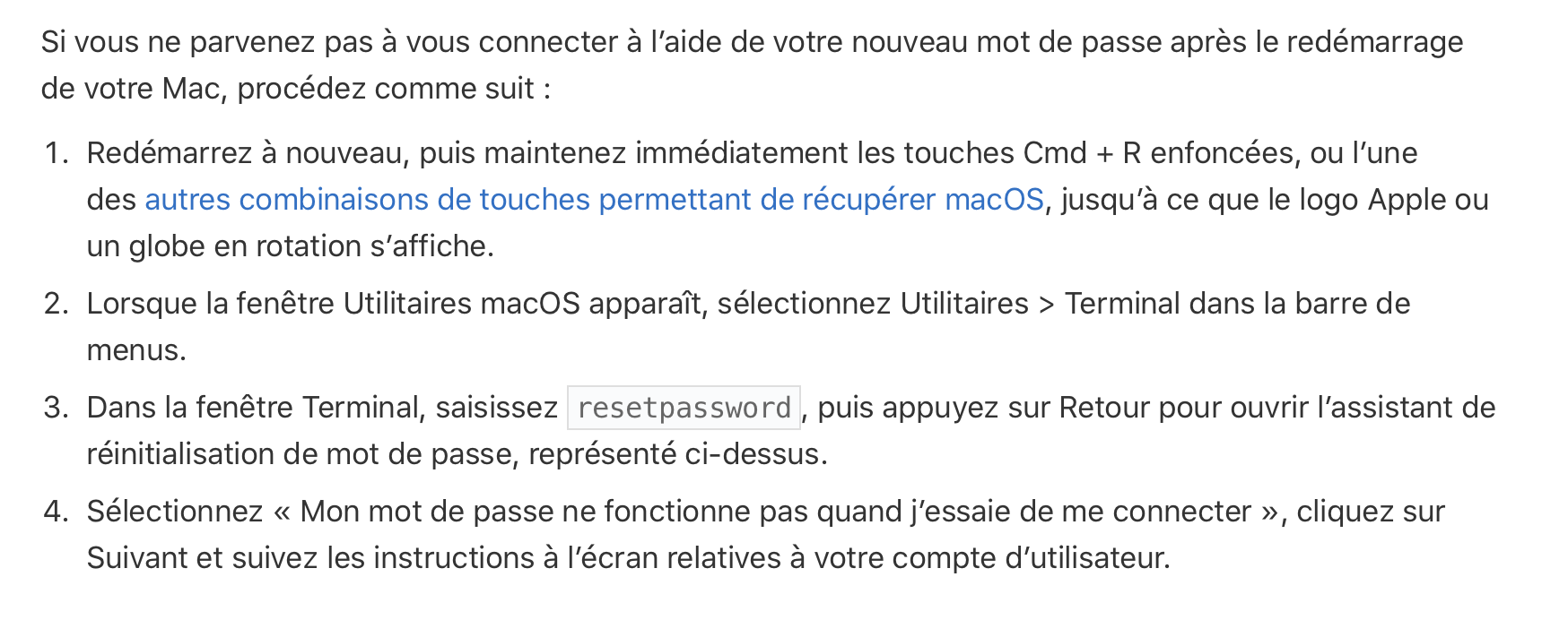 Il faudrait plutôt que tu suives cet article : Modifier ou réinitialiser le mot de passe d’un compte utilisateur macOS sous macOS Mojave ou version antérieure - Assistance Apple (FR).