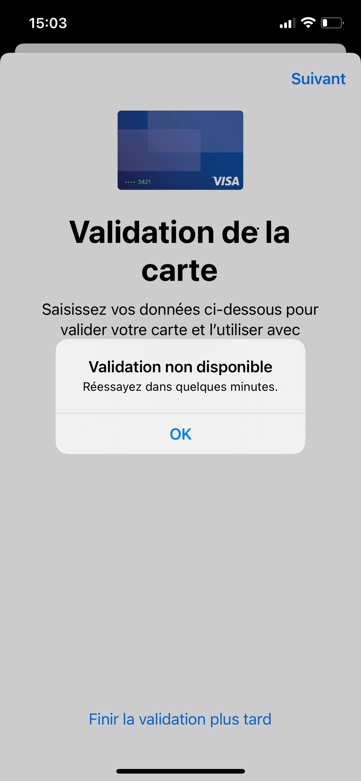 J'ai suivi l'ensemble des instructions ici (https://support.apple.com/fr-fr/HT205630) et aussi un redemarrage forcé mais j'obtiens toujours "validation carte non disponible". Que faire?