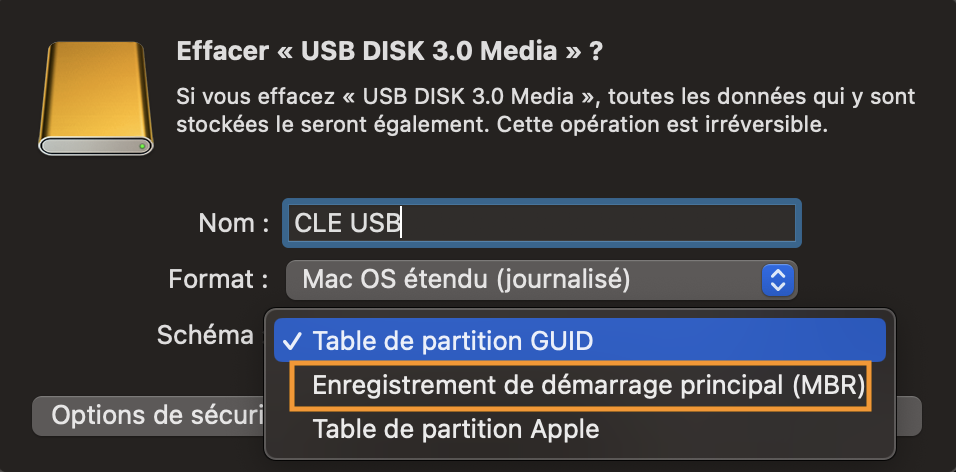 Donc il faut aller dans "Effacer", sélectionner "Disque physique", puis choisir "Format Mac OS étendu (journalisé)" et surtout "Schéma GUID".