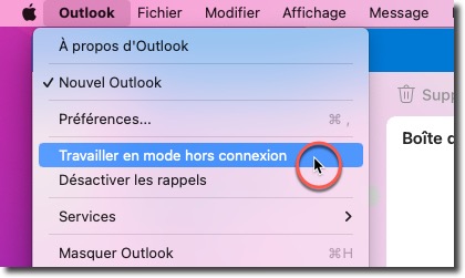 Ensuite, retournez dans le menu Outlook > Travailler en mode hors connexion et recliquez pour décocher le mode de fonctionnement "hors connexion".