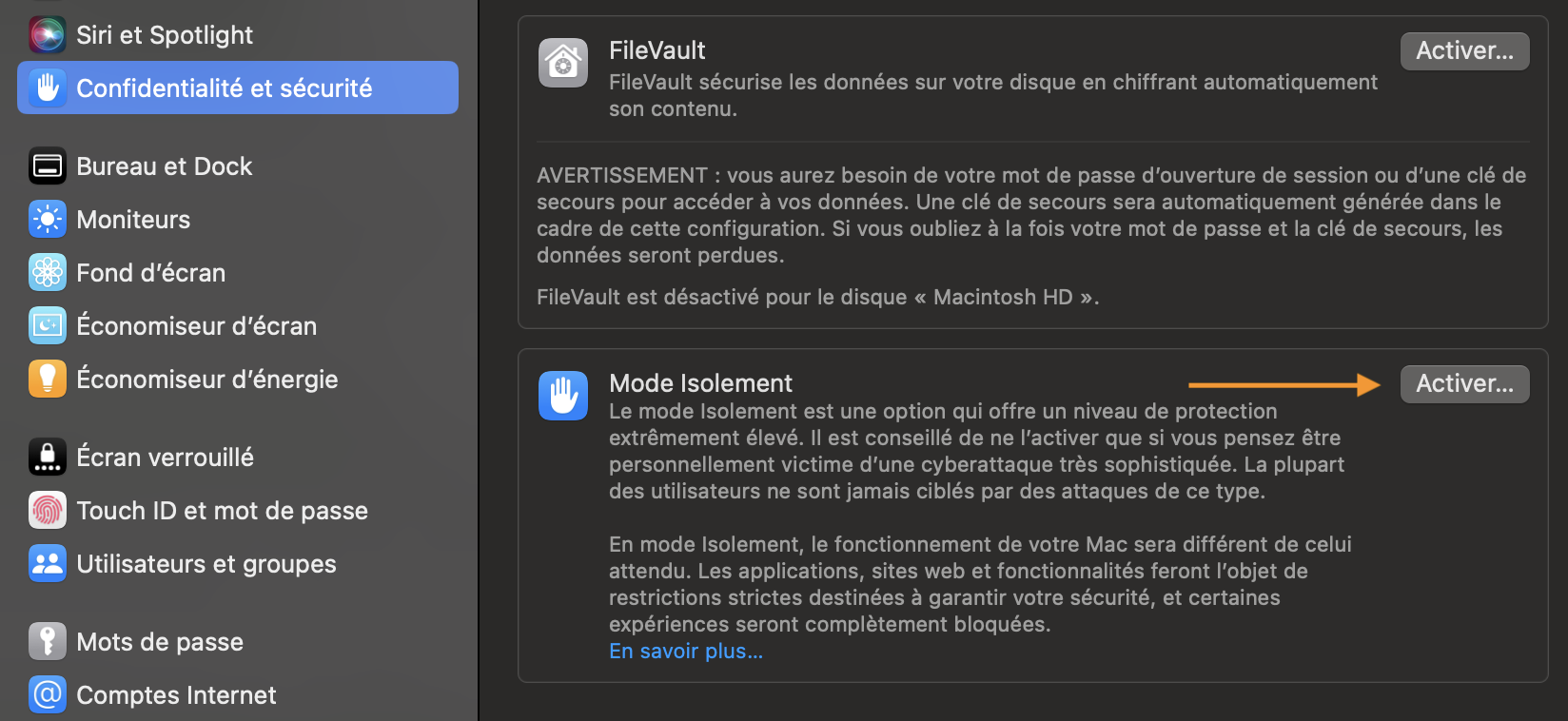 Fonction mode isolement Mac
