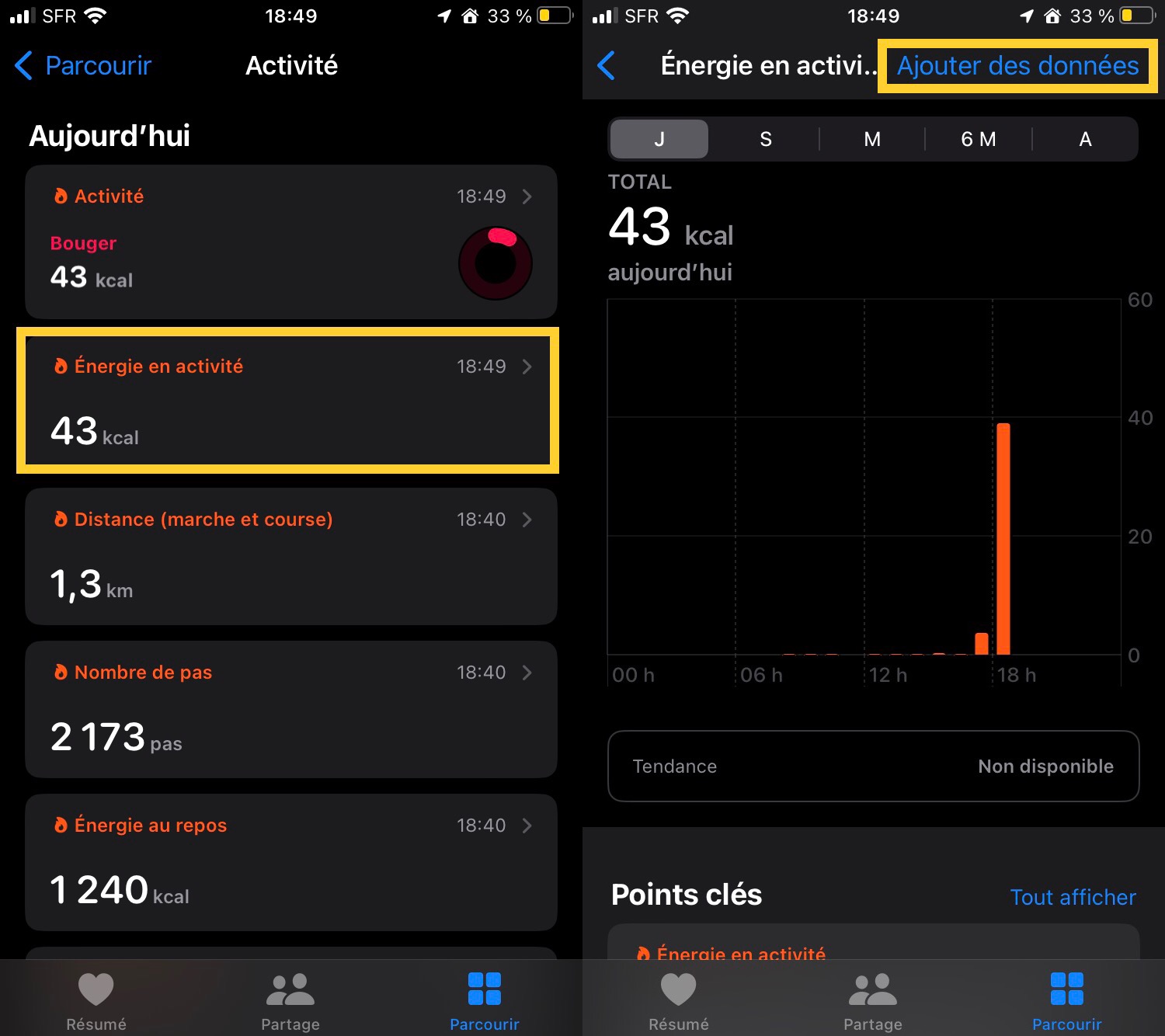 J’ai une deuxième question, mais un peut plus technique et vague (je m’excuse de ne pas être clair). Par moment comme par exemple quand je vais à la plage, pour éviter d’exposer mon iPhone au sable et au sel marin, je ne l’emporte pas avec moi. Un proche a une montre waterproof, qui compte les pas la distance et autre mesure. Même si la mesure des pas et valable que pour cette personne en fonction de sa taille, je voulais rajouter les mesures de distance et de pas à l’application santé. Je l’ai fait mais le nombre de kcal perdu ne s’est pas actualisé. Je me suis dit que je poivrais le rajouter manuellement également, mais j’ai pas trouvé comment faire, existerais t il une solution ? Puisque c’est surtout cette mesure qui m’intéresse, puisque pendant les 6 premiers mois, l’iPhone prend absolument TOUS en compte pour me donner une tendance de kcal que je devrais perdre par jour pour garder la même forme que les mois précédents, et sans ces mesures, la tendance sera moins précise.
