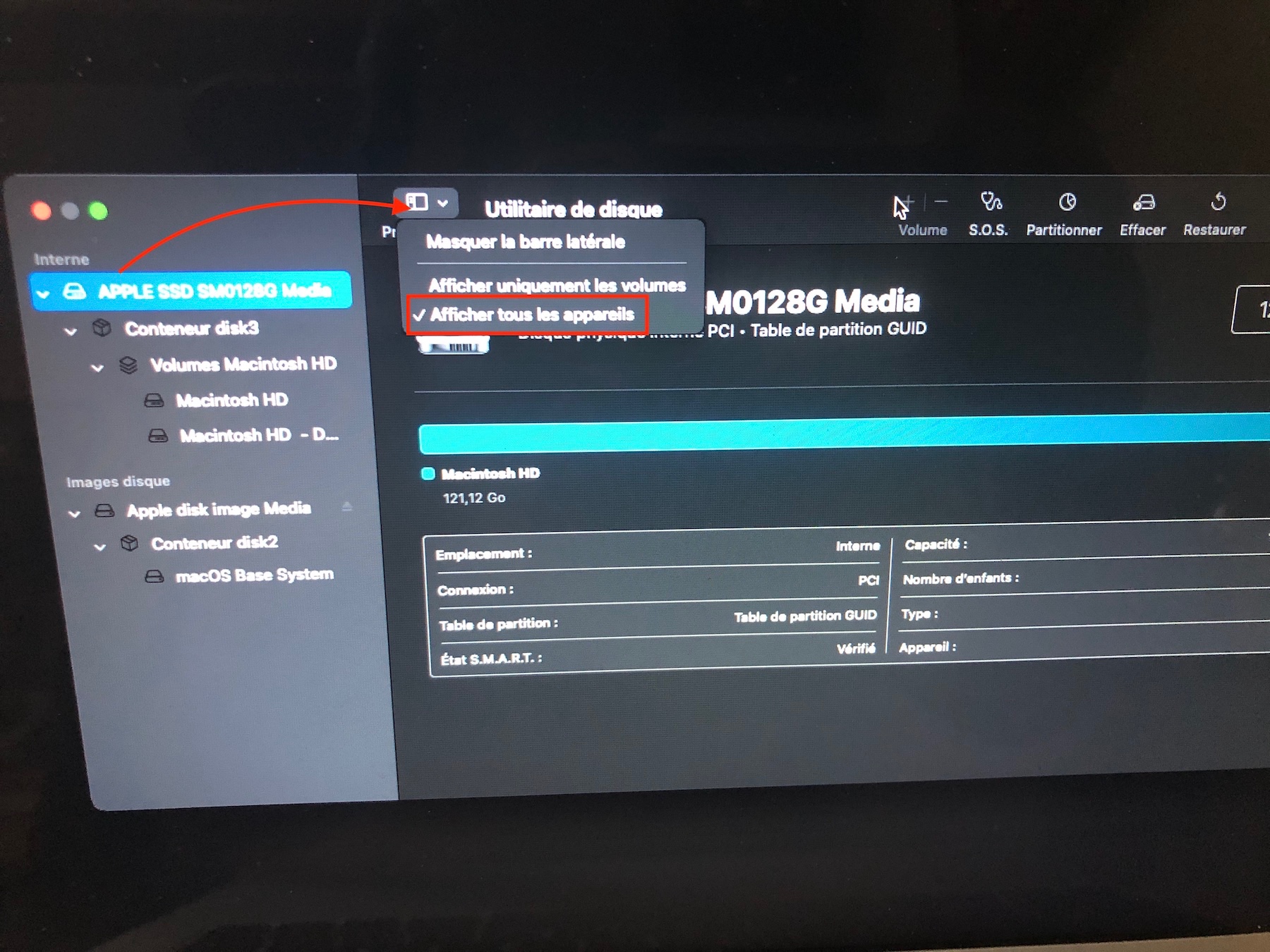 Dans l’utilitaire de disque, apparaît OS X Base Systèm et macOS Base system