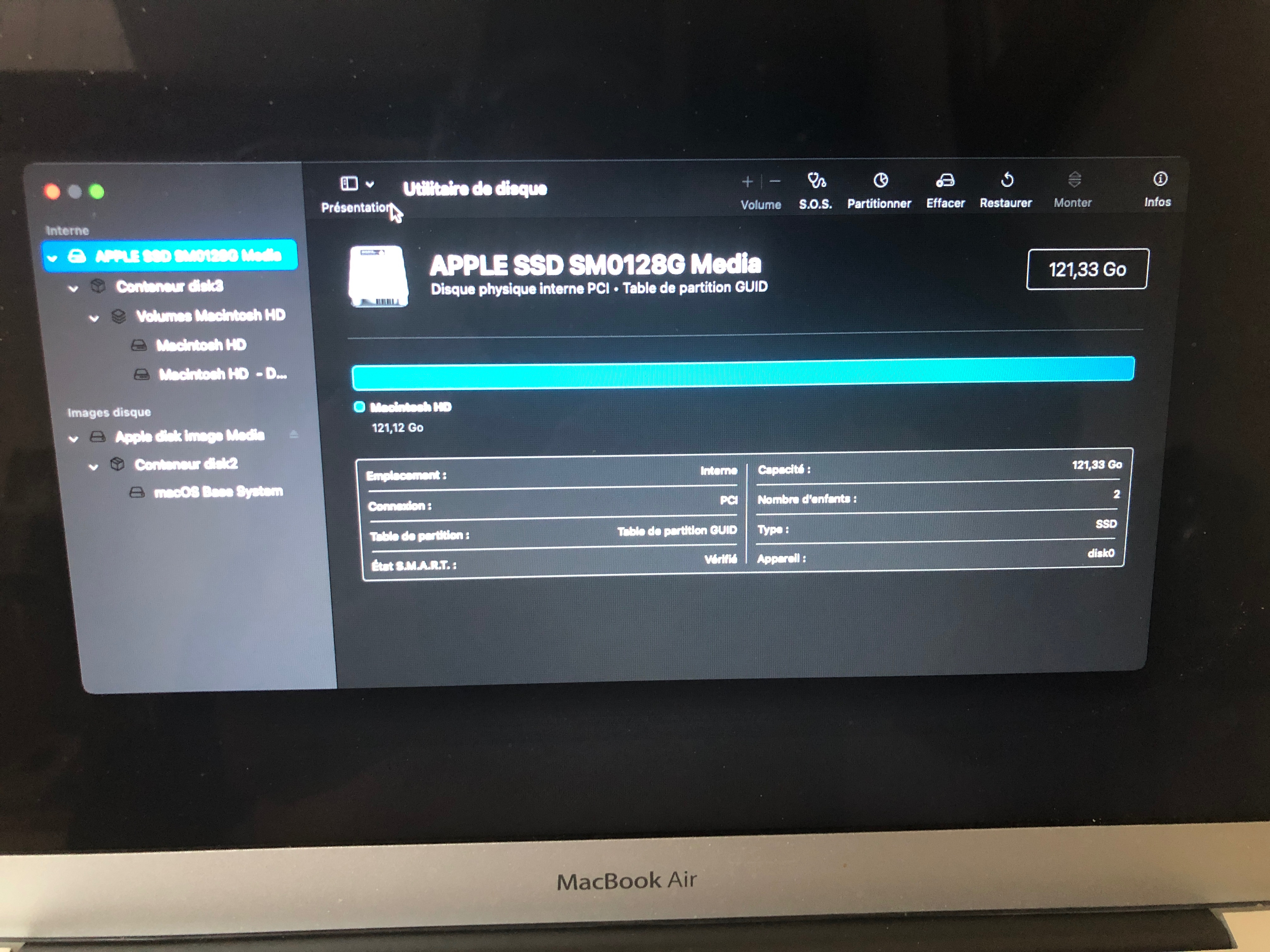 L’installation de macOs n’a jamais abouti donc je n’ai accès qu’à une page où j’ai le choix entre Safari pour dépannage, l’installation de macOs, Time Machine et l’utilitaire de disque