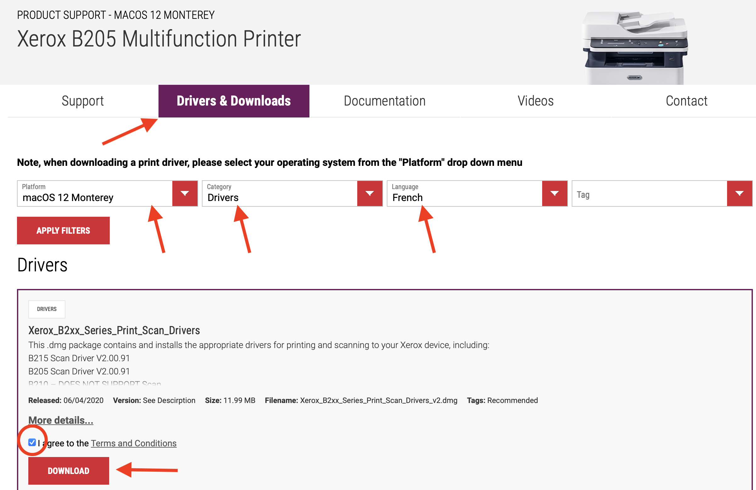 Sur cette page télécharger le dernier pilote disponible (soit pour macOS 12 Monterey) qui devrais être opérationnel sur Ventura et éventuellement sur Sonoma https://www.support.xerox.com/en-us/product/xerox-b205-multifunction-printer/downloads?language=fr&platform=macOS12