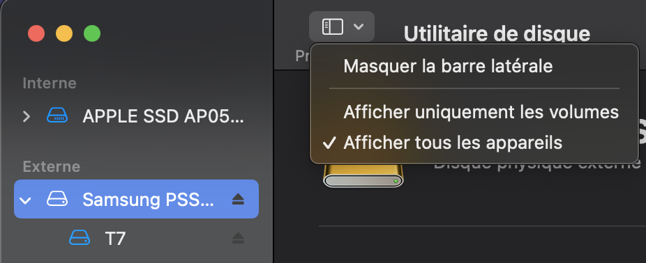 J'ai donc enregistré son contenu sur mon mac puis j'ai effacé mon disque dur pour le formater mais il ne m'est pas proposé le format APFS