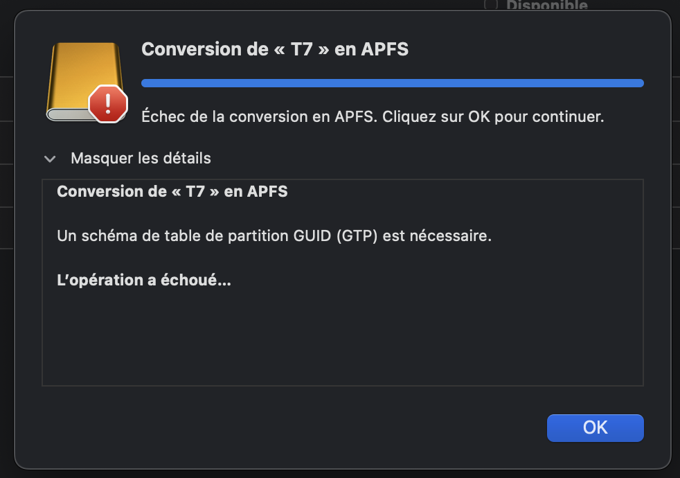 J'ai donc premièrement formaté au format MacOS étendu puis j'ai souhaité ensuite convertir en APFS (en faisant clic droit sur mon disque sur le gestionnaire de disque) mais un message d'erreur me dit que mon disque dur n'aurait pas de table de répartition GPT ce qui rendrait l'opération impossible.