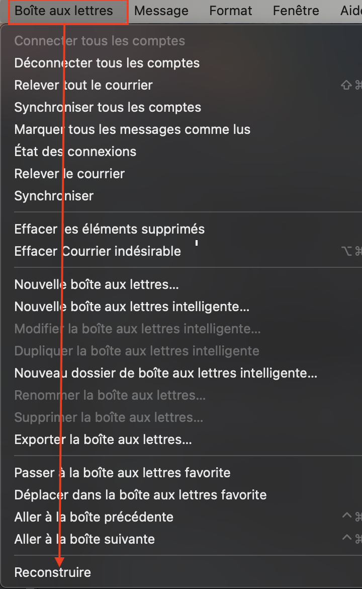 cliquer sur celle-ci dans la barre latérale de Mail puis dans la barre des menus/ Reconstruire