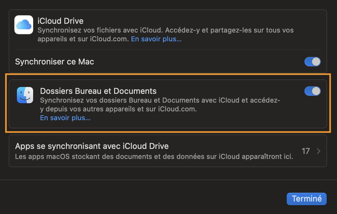 Si toutes ces conditions sont respectées, dans Desktop ou Documents, tu peux retrouver ton dossier si la Synchro a fonctionné, ce dossier sera peut-être ouvrable.
