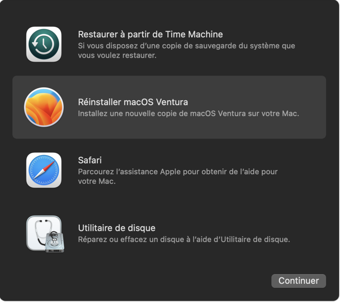 Dans cet écran, choisissez "Réinstaller macOS", puis suivez les instructions à l’écran. En savoir plus sur la réinstallation de macOS à l’aide de la fonctionnalité de récupération de macOS.