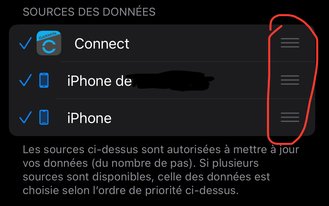 On dirait que ton app Santé ne prend pas en compte ta montre Garmin comme source pour compter les pas, mais en même temps, ta montre est bien considéré comme une source, c'est assez curieux 🤔.