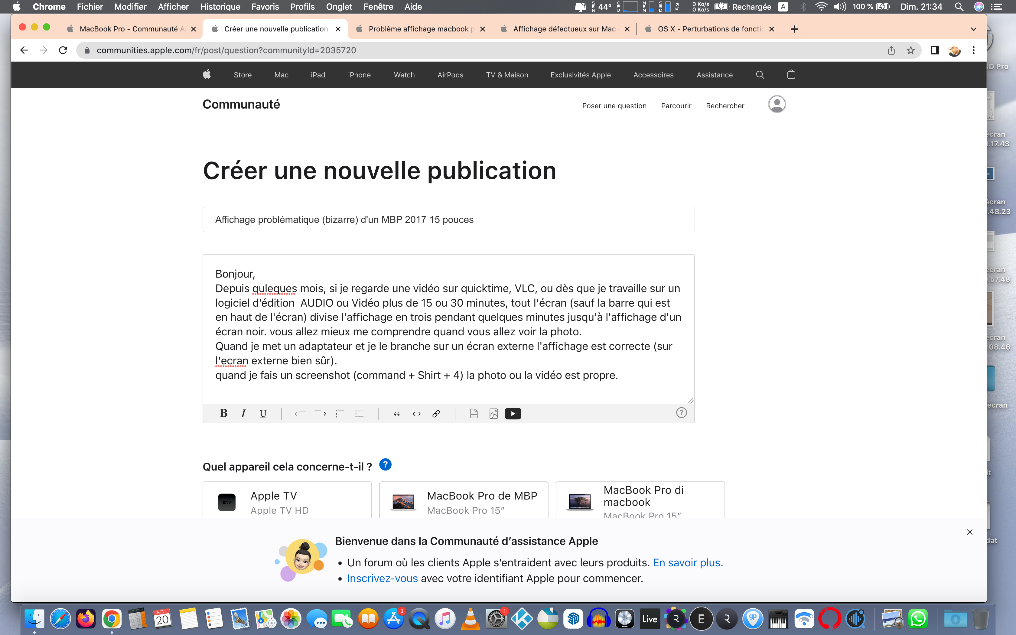 Si je regarde une vidéo sur quicktime, VLC, Youtube, ou dès que je travaille sur un logiciel d’édition AUDIO (LOGIC PRO) ou Vidéo (FCPX) plus de 15 ou 30 minutes, tout l'écran (sauf la barre qui est en haut de l'écran) divise l'affichage en trois pendant quelques minutes jusqu'à l'affichage d'un écran noir. vous allez mieux me comprendre quand vous allez voir la photo.