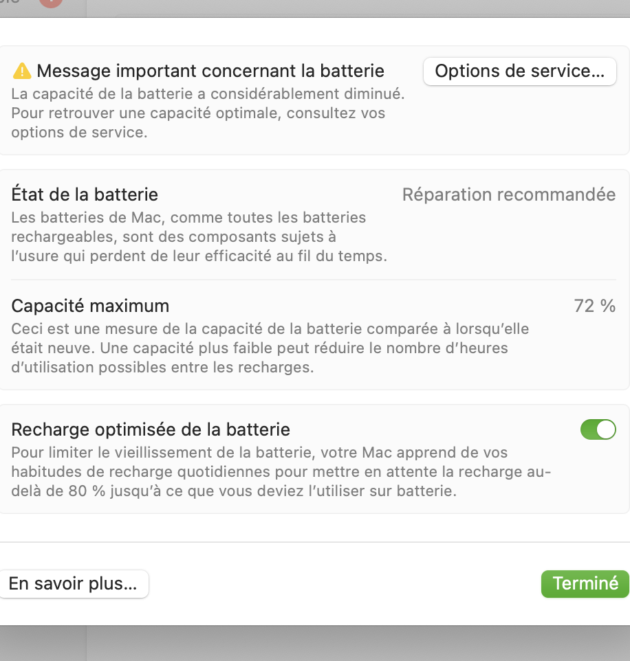 Pour réaliser le remplacement de la batterie de votre MacBook et obtenir une estimation de son prix, je vous invite à suivre ce lien : Service après-vente et réparation du Mac - Assistance Apple (FR)