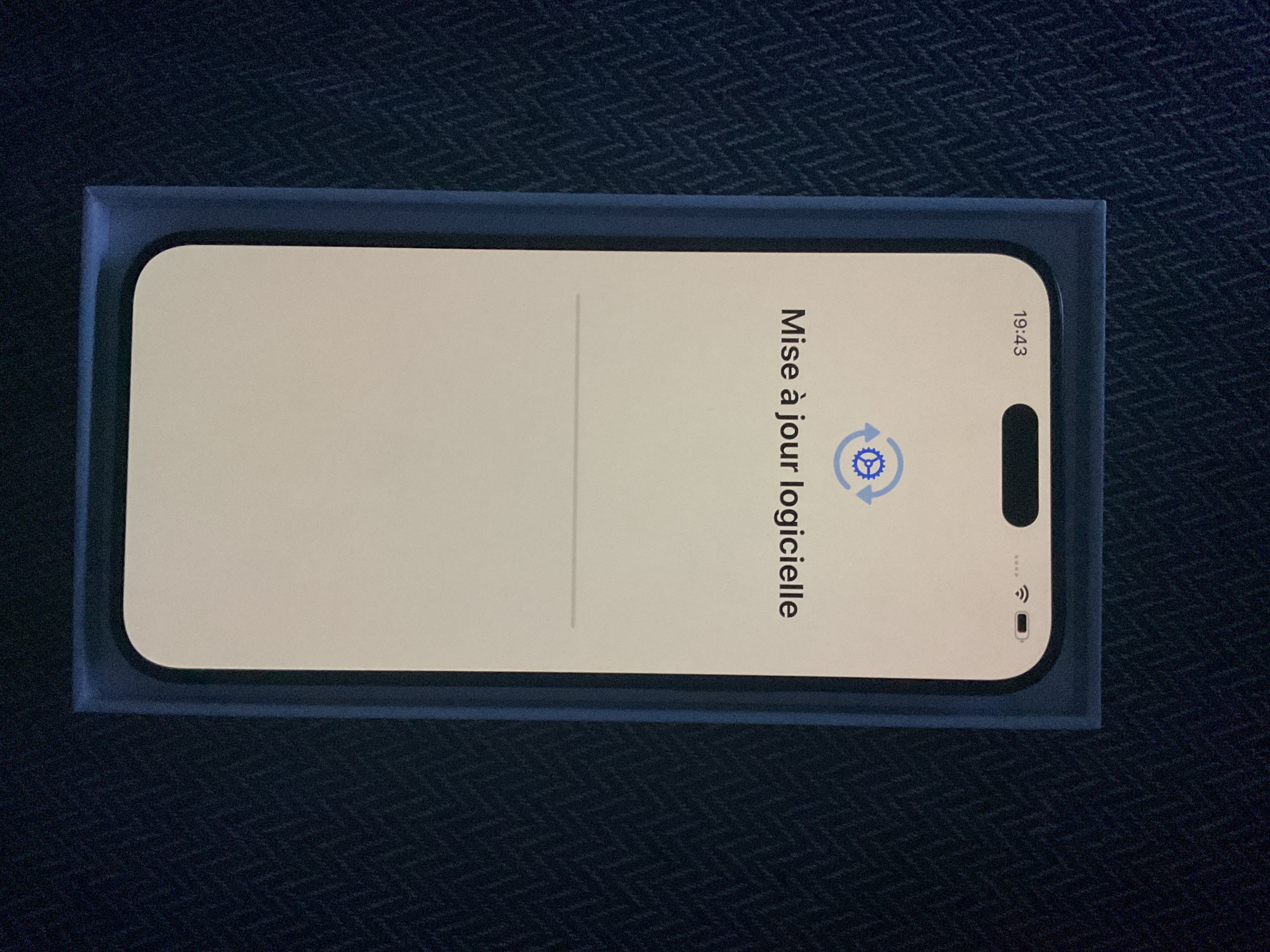 Je viens à peine de chercher mon iPhone 15 à l’Apple store. En rentrant je vais pour le configurer avec mon iPad à côté, tout se fait et on me propose de faire une mise à jour logiciel que j’accepte et depuis il est bloqué sur cette image depuis 20min (ci-joint). Impossible de faire quelque chose ou de le fermer.