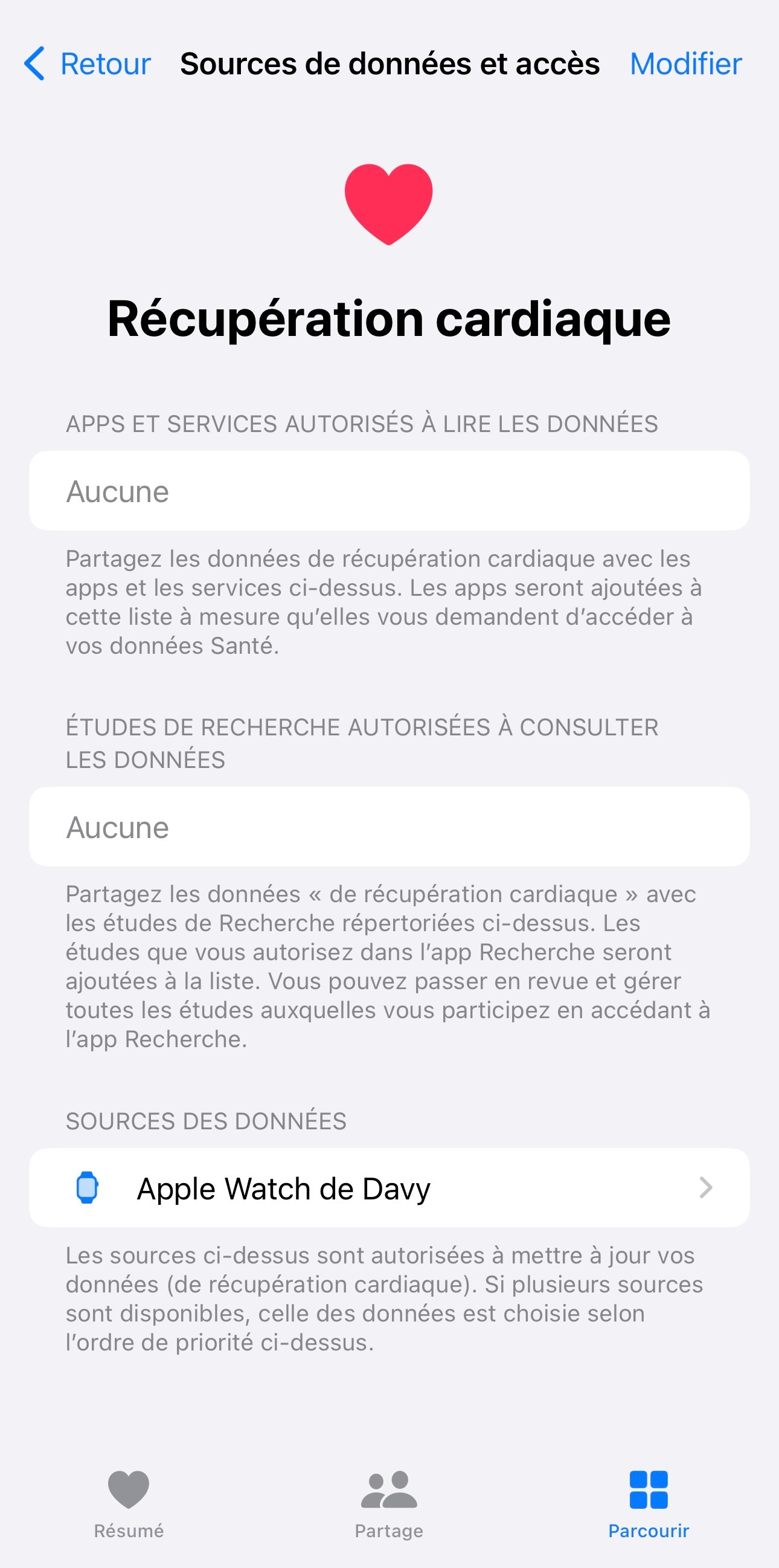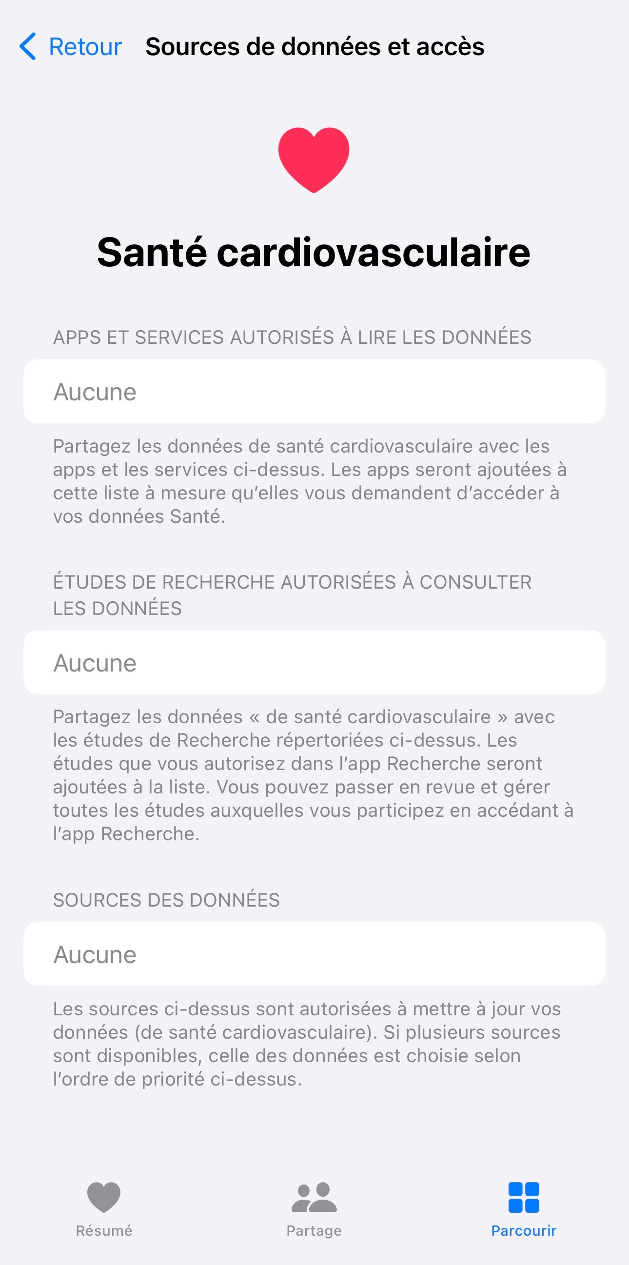 Voici les capture d'écran de mon iPhone avec l'onglet "source de données et accès santé cardiovasculaire" différent suivant le type de suivi :
