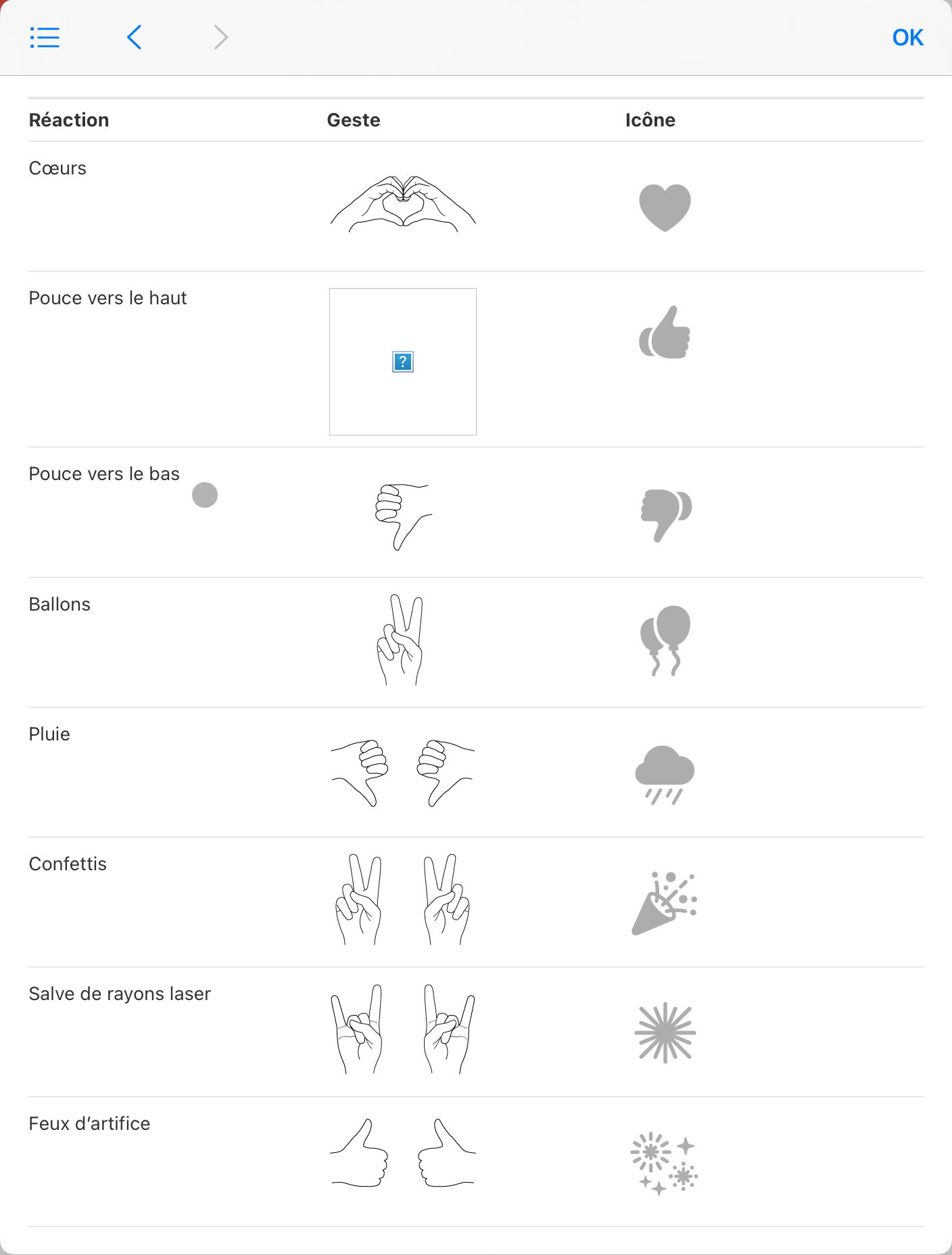Quelqu’un aurait une liste des réactions possibles avec la caméra dans iPadOS 17 avec les gestes nécessaires ?