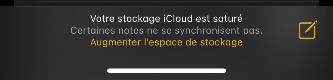 Depuis quelques temps j’ai un message « Votre stockage iCloud est saturé » en bas de mes Notes lors de la synchronisation iCloud alors que mon stockage iCloud est plein à moitié, 2,5Go / 5Go (voir photos jointes).