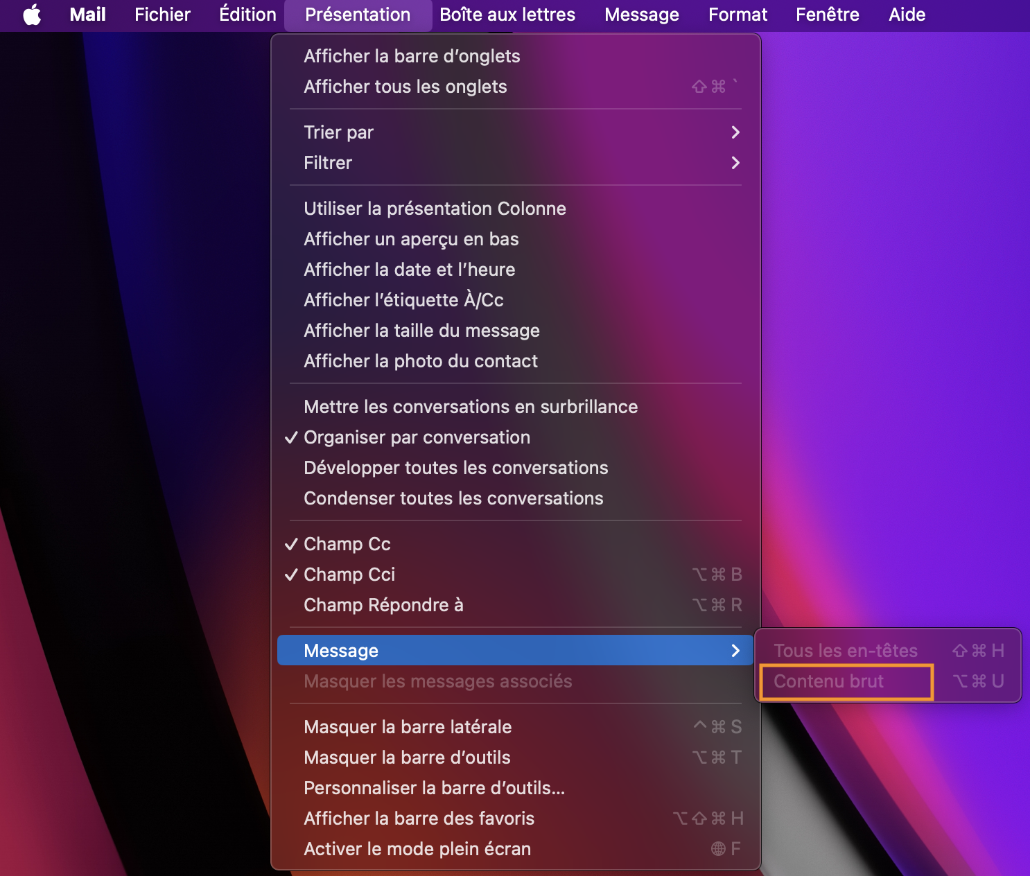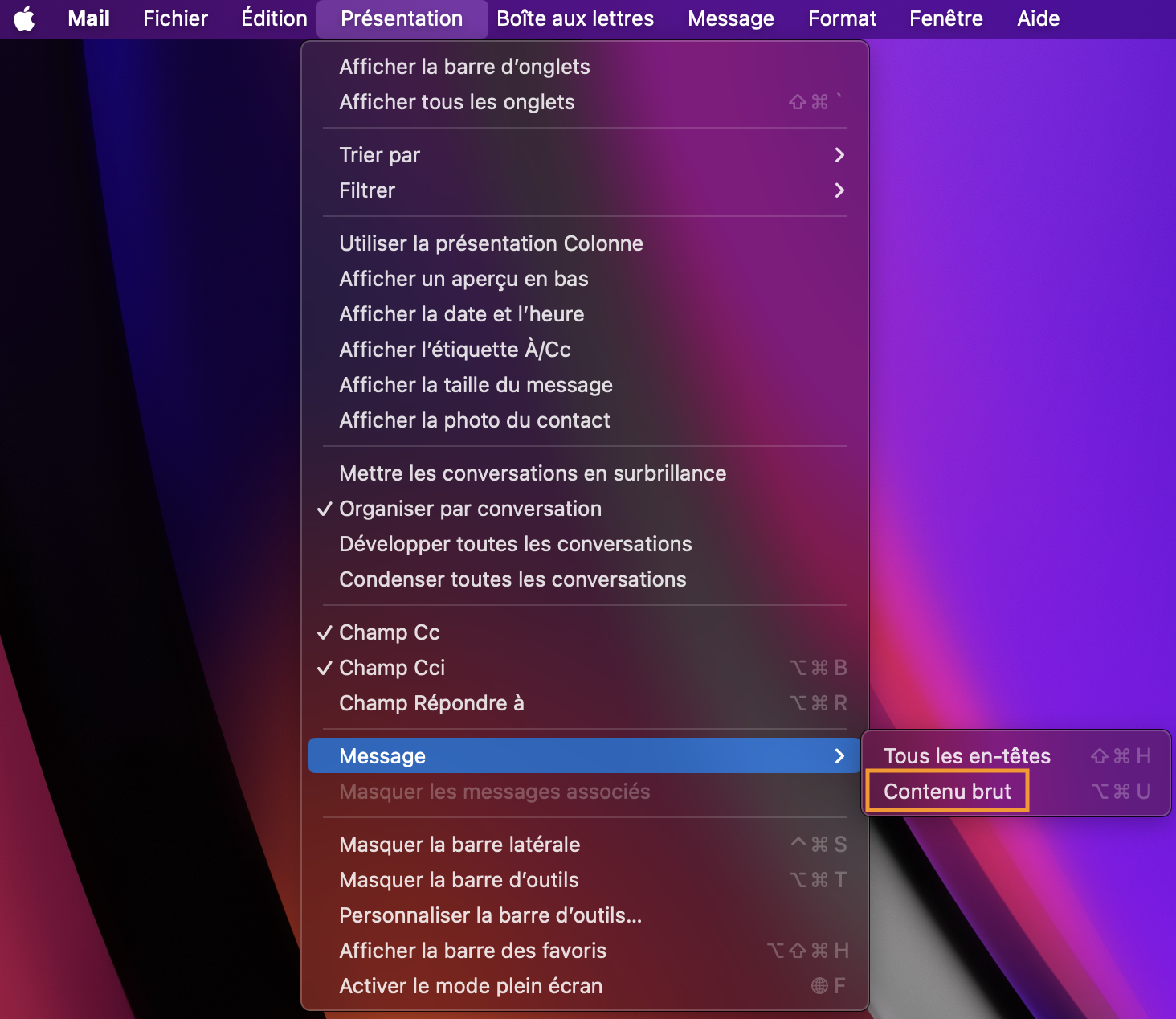 On transmet chaque contenu brut pour signaler chaque spam . En ouvrant Mail, en cherchant dans l'onglet Présentation on doit chercher et copier le contenu brut du spam. Mais à ce jour cette ligne dans présentation reste grisée n'est pas activée Merci de m'indiquer la marche à suivre.