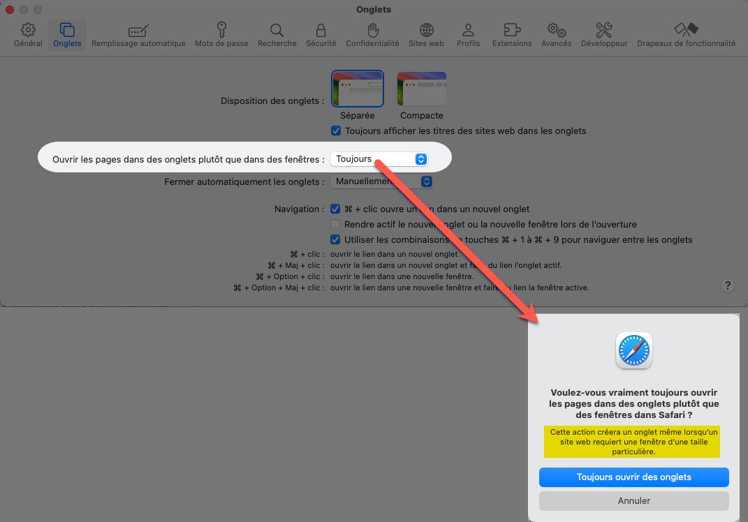 BUG Safari 17.1 : forcer ouverture d'un ONGLET plutôt qu'une nouvelle fenêtre