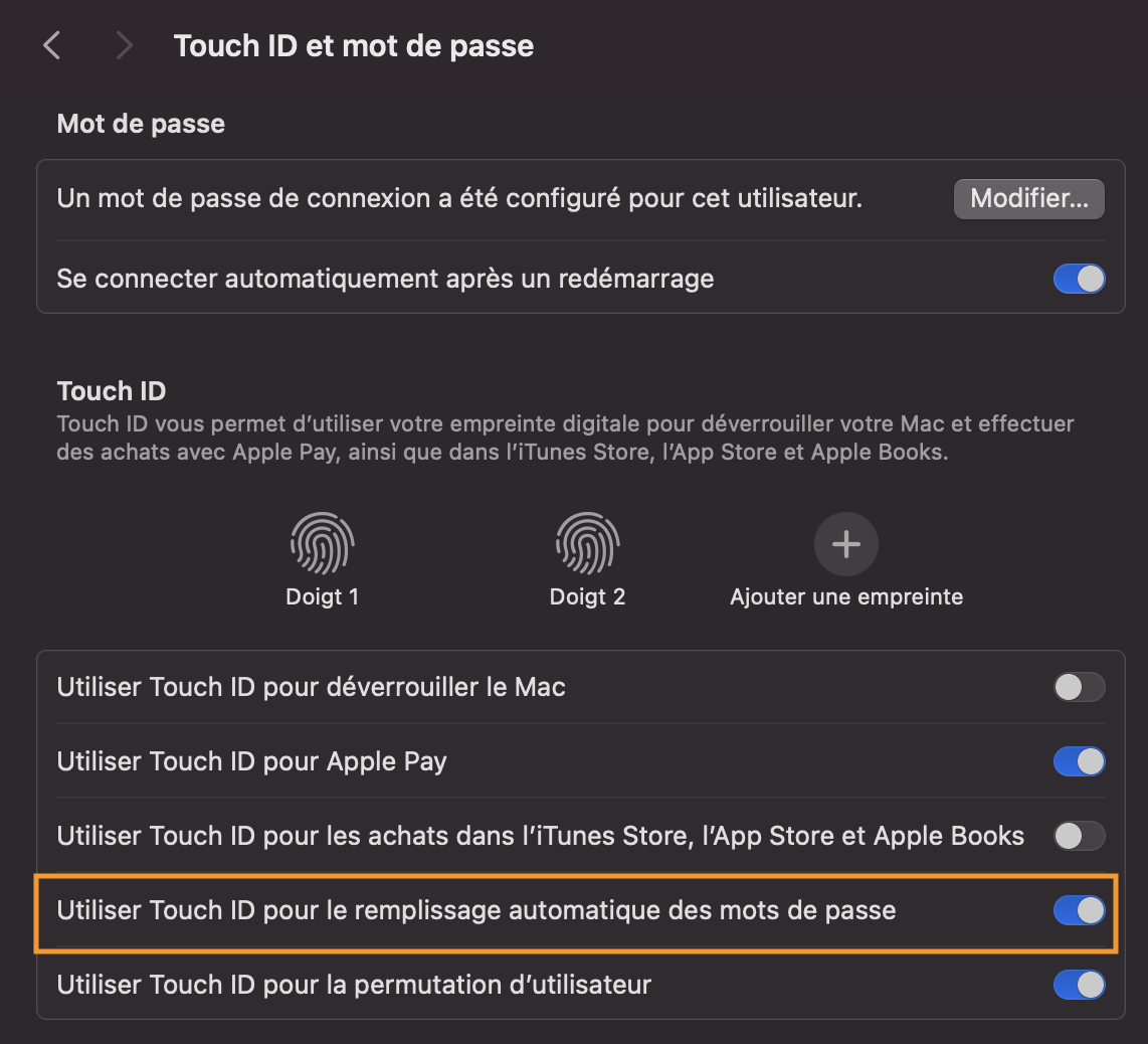 Je n'utilise pas sparsebundle, mais c'est juste une déduction, comme il t'est demandé d'entrer un mot de passe, logiquement, si l'option ci-dessous est cochée, il devrait t'être proposé "Touch ID".