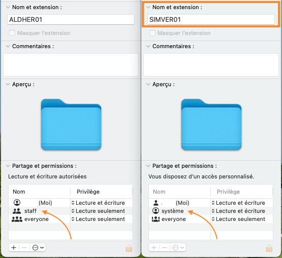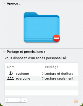 Les réglages d’autorisation au bas de la fenêtre Infos.(Source : Modifier des autorisations pour les fichiers, les dossiers ou les disques sur Mac - Assistance Apple (FR))