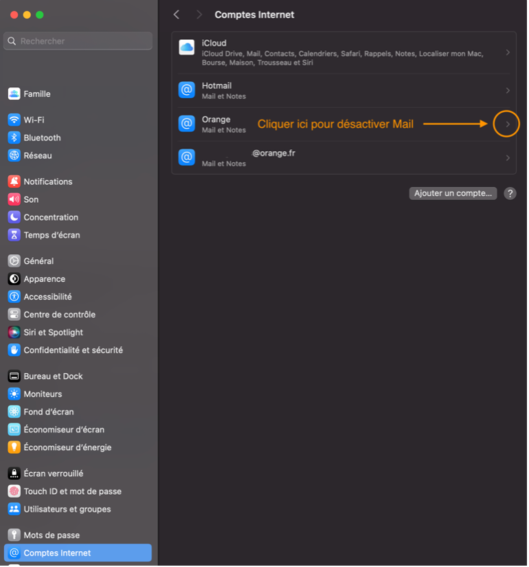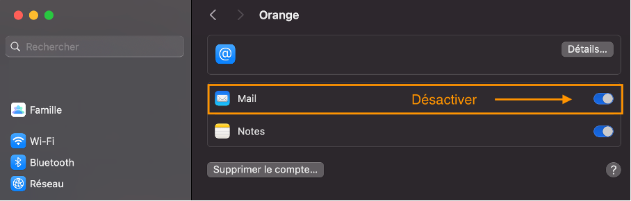 Pour les autres comptes Mail, cliquer (comme sur copie écran ci-dessus), sur la flèche à droite puis Désactiver Mail.