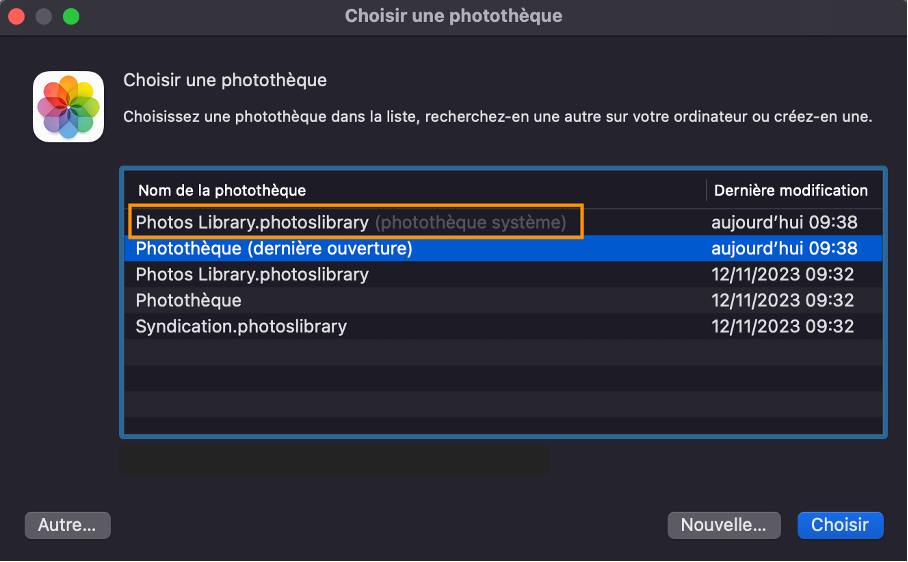 Maintenir la touche Option enfoncée lors de l’ouverture de Photos pour savoir quelle photothèque est définie comme photothèque système (Dans mon cas ci-dessous, je n'utilise pas la photothèque système) :