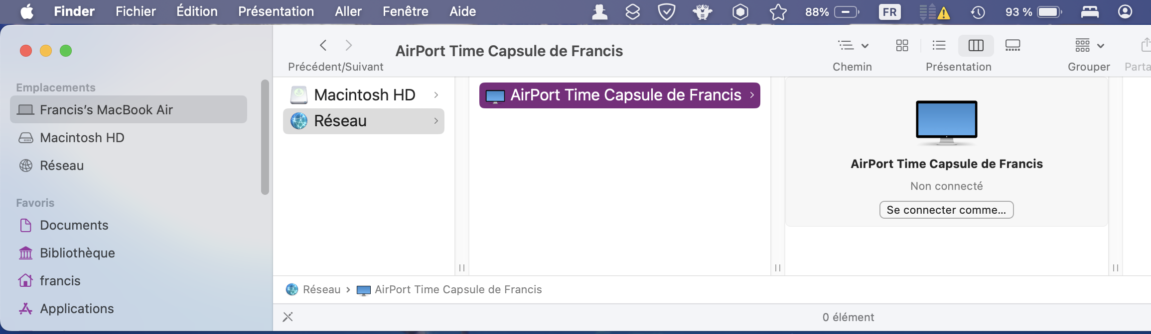 J'avais effectivement déjà effectué ces connexions mais je n'étais pas parvenu à voir mes sauvegardes de MacBook Air, seulement celles du MacBook Pro avec lequel je me connectais. Voici une capture d'écran lorsque j'accède aux données du Airport Time Capsule