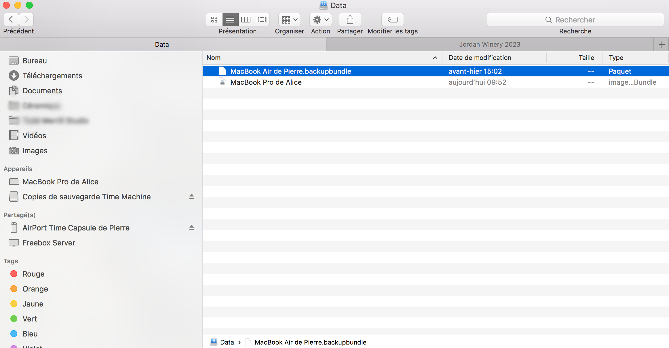 On voit bien les sauvegardes du Macbook Pro dans la barre latérale mais pas celle du MacBook Air.