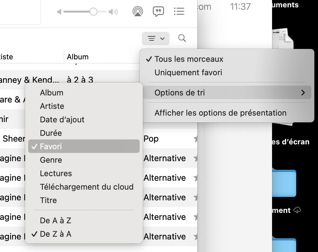 Tu peux trouver les favoris à partir des trois traits dans le coin droit lorsque tu es sur les morceaux de ta bibliothèque