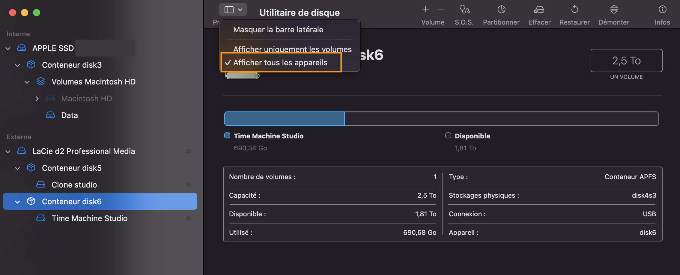 Ensuite, pour répondre à ta question, la colonne de gauche de la fenêtre de l'Utilitaire de disque affiche la liste des appareils physiquement attachés à ton Mac.