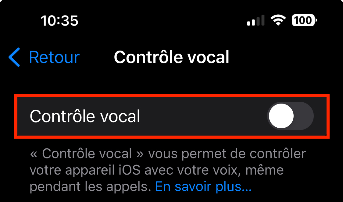 Pour désactiver le contrôle vocal sur ton iPhone, il faudra que tu ailles dans Réglages > Accessibilité > Contrôle vocal et que tu désactives l'option Contrôle vocal.