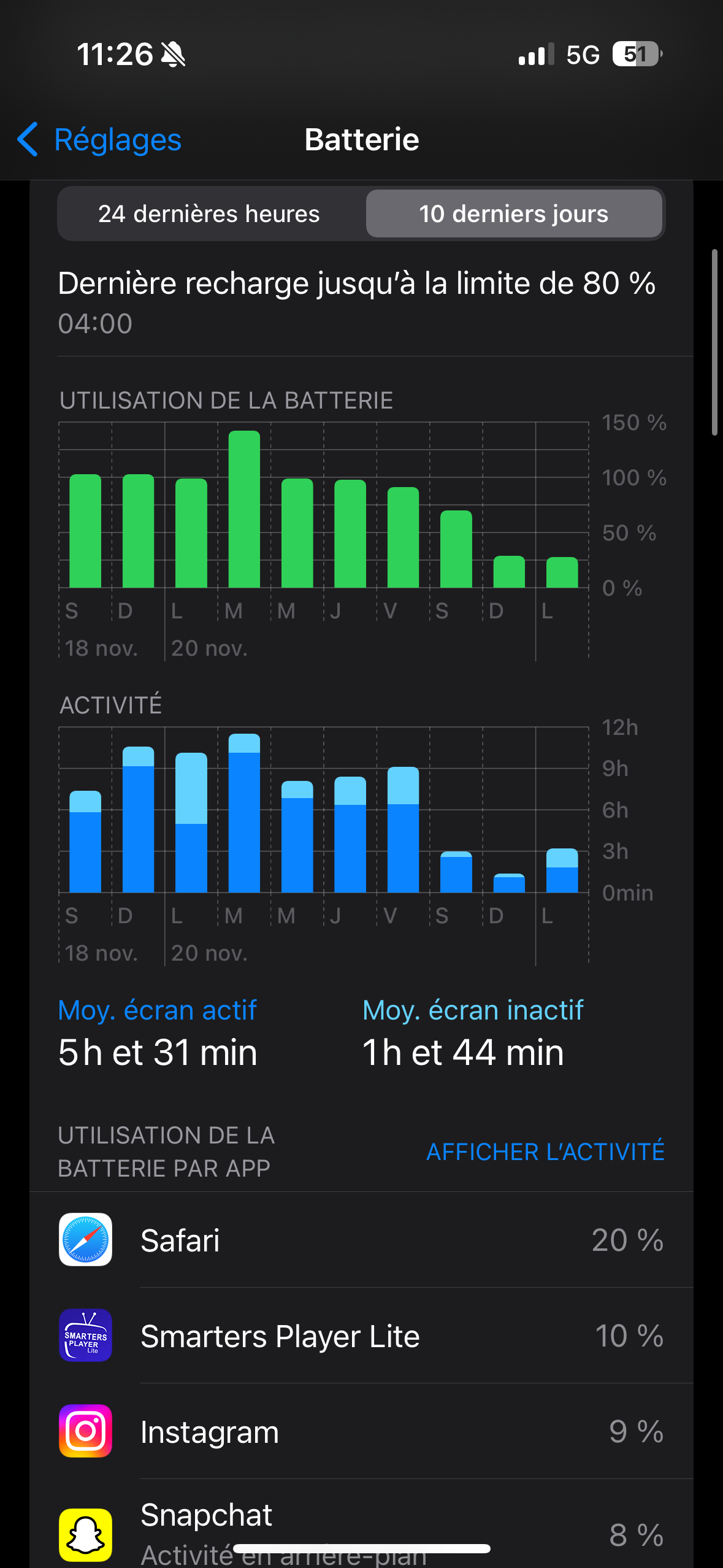 J’ai acheté un iPhone 15 pro il y’a 2 mois et je trouve que la batterie est pas si impressionnante que ça, en temp d’écran je tien 7h maximum ( de 100% à 0%). J’ai plusieurs photo des paramètres batterie que je vous mets juste après. Je sais que certaines application bouffe de la batterie mais on est quand même sur le dernier iPhone qui est censé avoir 9h d’autonomie…