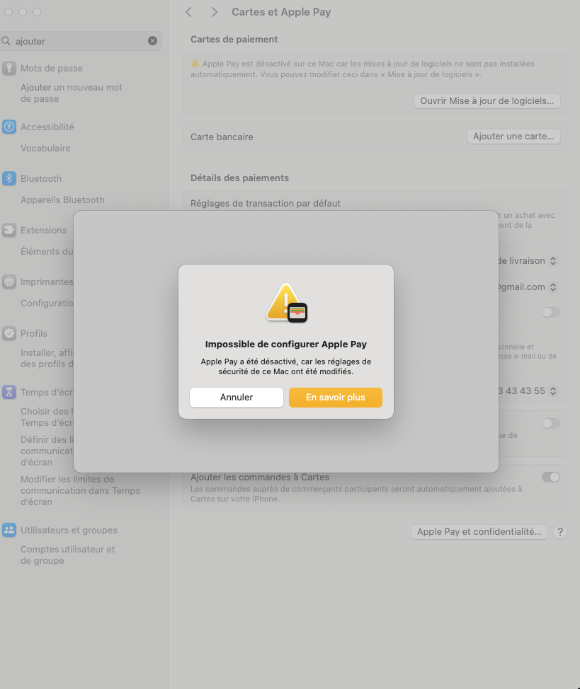 je ne peux pas simplement remplacer ma carte credit par une nouvelle. Une fois sur "Cartes et Apple Pay" un message d'erreur "Impossible de configurer Apple Pay. Apple Pay a été désactivé,..." . L'actuel CB