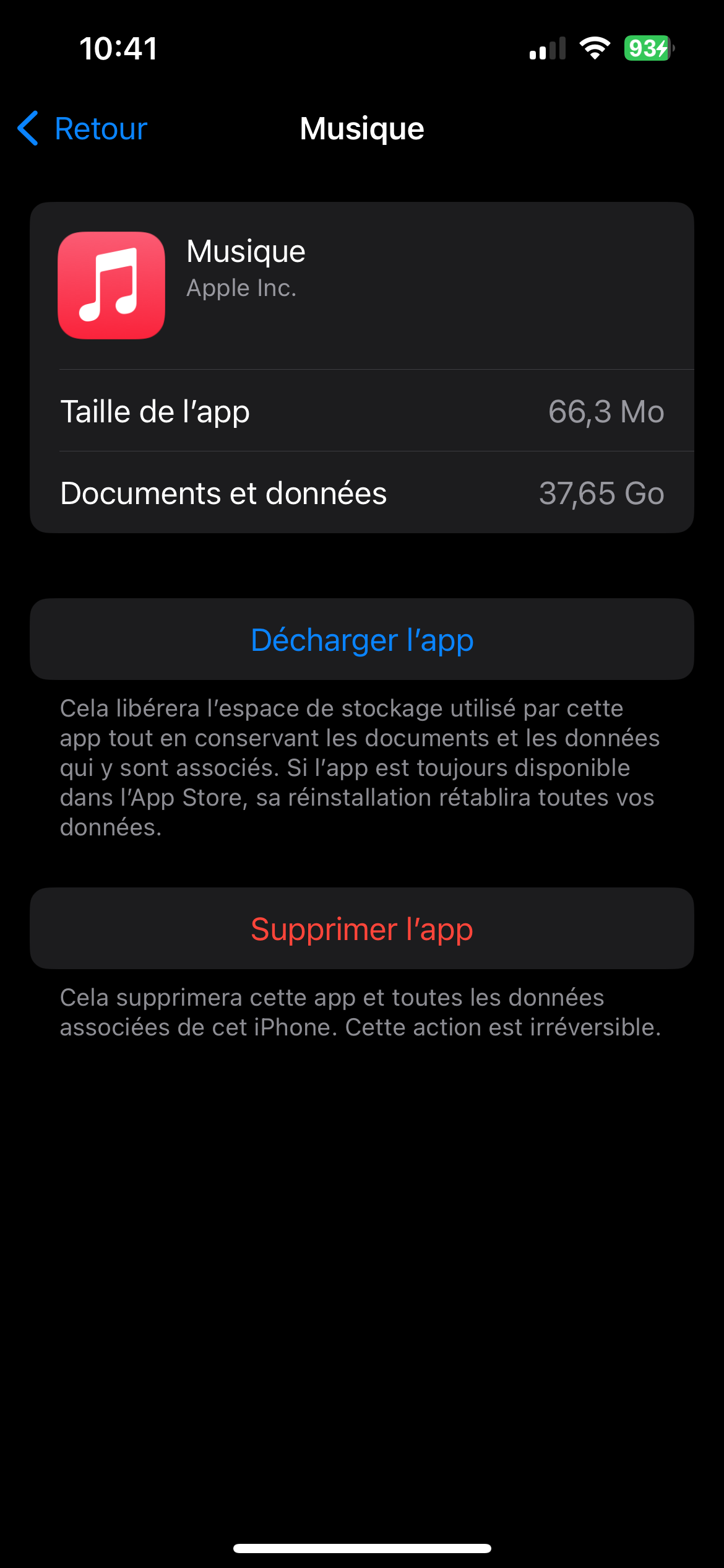 Depuis maintenant quelques mois, mon application ne cesse de croître en giga utilisés sur mon IPhone, elle occupe aujourd'hui plus de 37 Go. Cela est complétement anormal, car je n'ai aucune musique d'installée, et le réel problème est que c'est surtout incontrôlable et ne cesse d'augmenter (preuve en image ci-dessous). Je ne peux rien y faire et je n'ai pas trouvé de personnes ayant un problème aussi important en terme d'espace de stockage.
