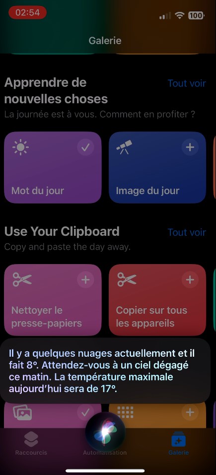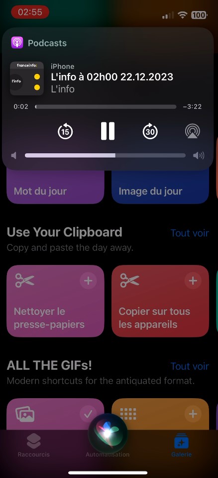 J'ai installé depuis la Galerie le raccourci "Mot du Jour" (section "Apprendre de nouvelles choses") pour voir à peu près comment ca marche. Je l'ai immédiatement lancé via Siri ("Dis Siri, Mot du jour") et, quelle ne fut pas ma surprise quand Siri m'a énoncé les prévisions météo (photo 1), puis m'a lancé les actualités de France Info via Podcasts (photo 2).