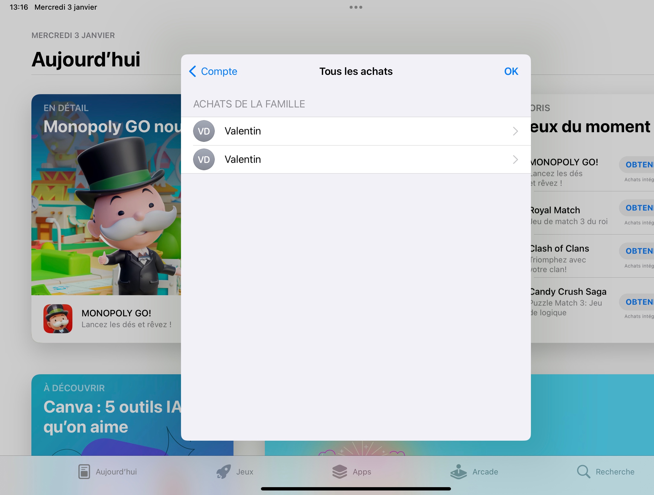 Bonjour, j'ai un problème que je n'arrive pas à résoudre. Je souhaite accéder à mes applications téléchargées dans « Achats » depuis l'Apple Store mais lorsque je clique dessus, je tombe sur le nom d'un des comptes familiaux qui ne possède aucune application téléchargée. J'ai désactivé le partage familial mais rien ne fonctionne. Je souhaite accéder à mon historique d'achats pour télécharger une application. J'ai remarqué que je peux trouver cette application lorsque je vais sur mon profil et que je clique sur « Historique des achats », mais je ne peux pas l'installer, et je pense que je ne peux l'installer que dans « Achats ».
