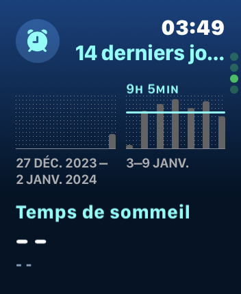 Bonjour j’ai un petit soucis avec mon Apple watch série 8 gps voilà je la porte maintenant depuis le 02/01 j’ai bien activer l’option sommeil avec Apple watch tout es bien régler, je dors avec depuis maintenant 6 jours quand je constate les données sur la montre pas de soucis tout y es sauf le temps de sommeil, je vous joins une capture d’écrans provenant directement de la montre