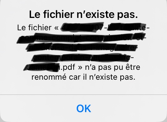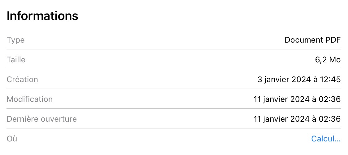 J'ai un document important sous forme de PDF que je ne peux pas ouvrir depuis l'application Fichiers. Je ne peux pas le renommer, le déplacer, il est figé. Cependant, quand je vais dans la rubrique "Lire les informations", il y a une ligne "Où" qui est affichée, qui me donne l'information "Calcul..." écrite en bleu. J'aimerais bien savoir sil était possible de débloquer ce fichier. Il n'est pas installé sur mon iCloud, il y a bien la mention "Sur mon iPad", mon stockage n'est pas saturé non plus. Est-ce que c'est ce fameux "Calcul..." qui bloque tout ? J'ai annoté le fichier, peut être que c'est ça aussi qui ne marche pas?